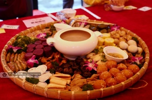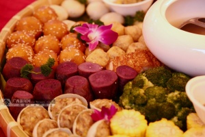 记者在现场看到,客家豆腐酿、瑶家大肚糍、桂江鱼……此次长寿簸箕宴,几乎汇集了贺州所有长寿美食,各县区的主厨们将经过权威评审获奖的长寿佳肴盛放在1个大圆簸箕里面,分别是1汤、4荤、8酿、4至8个小吃主食,供10人享用。