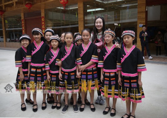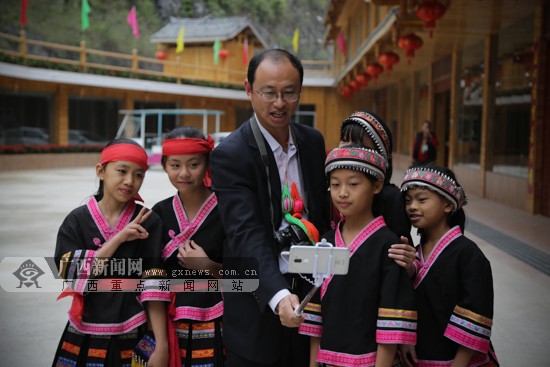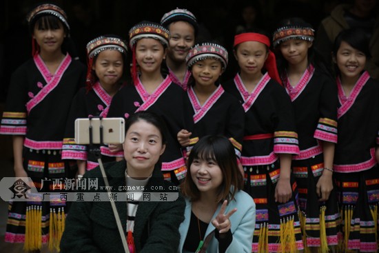 广西新闻网大化11月29日讯(全媒体报道组)11月29日上午,“ 生态长寿地 三姐文化城——2016全国重点网络媒体河池行”采访团刚来到大化瑶族自治县吉善瑶族新村,就被一群身着少数民族盛装的可爱"瑶妹"热情地围住。看到她们如此可爱乖巧,网咖们纷纷拉住她们合影,在相机手机里留下美好的回忆。