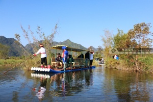 采访团乘坐竹筏参观澄江河湿地公园。广西新闻网记者 唐沛尧 摄