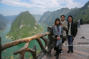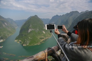广西新闻网东兰12月2日讯(全媒体报道组)“桂林山水甲天下,东兰红河盖阳朔”。12月2日,“生态长寿地 三姐文化城——2016全国重点网络媒体河池行”采访团乘船考察红水河第一湾。红水河从坡豪沿红水河南下十余公里,到三石镇板文村境内,在这里拐了一个大弯,形成一个“U”字型的大峡谷。当天,采访团成员登上观景台,鸟瞰红水河第一湾盛景。