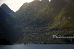 广西新闻网东兰12月2日讯(全媒体报道组)“桂林山水甲天下,东兰红河盖阳朔”。12月2日,“生态长寿地 三姐文化城——2016全国重点网络媒体河池行”采访团乘船考察红水河第一湾。红水河从坡豪沿红水河南下十余公里,到三石镇板文村境内,在这里拐了一个大弯,形成一个“U”字型的大峡谷。当天,采访团成员登上观景台,鸟瞰红水河第一湾盛景。