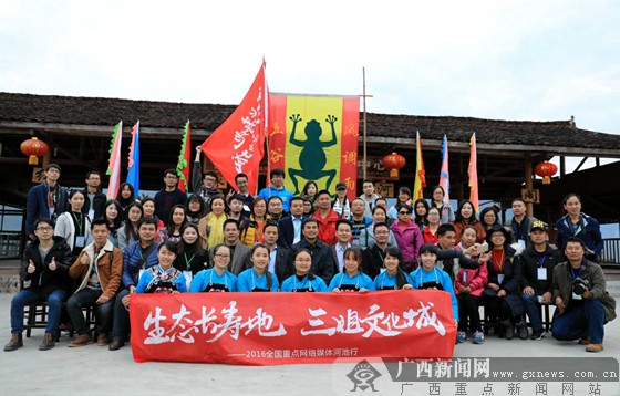 “生态长寿地 三姐文化城——2016全国重点网络媒体河池行”采访团在考察天峨六美农业生态园后合影。广西新闻网记者 严江萍摄