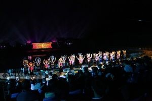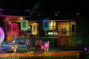 记者在现场看到,《梦·巴马》的表演舞台设置在巴马赐福湖的湖面上,整个舞台充满着少数民族地区的特色,并借助当今世界顶级灯光音响设备,在波光粼粼的赐福湖上打造一个由月光、星光、灯光、水幕构成水天一色的梦幻世界。200多人的表演队伍来自周边的村庄,表演巴马本土目前濒临失传的歌舞,其中,以裸浴文化最受人关注。裸浴在巴马地区流传了几千年,裸浴代表着巴马本地人的民风、民俗,与巴马人的生活密不可分。而《梦·巴马》正是以独特的艺术形式让人们欣赏和了解巴马长寿文化。