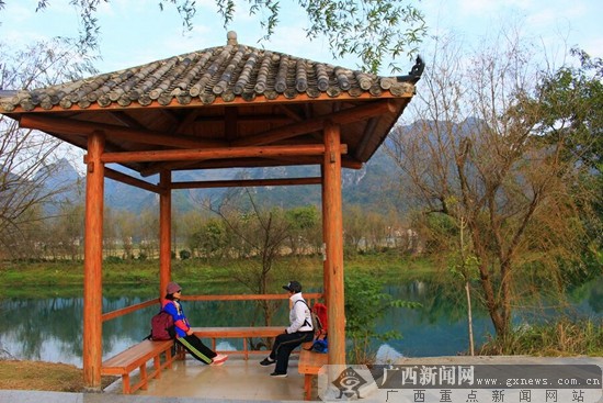 一位老人正在盘阳河畔悠闲钓鱼。广西新闻网记者 严江萍 摄 广西新闻网巴马12月4日讯(全媒体报道组)在巴马瑶族自治县往凤山县二级公路上,有一座集休闲旅游、养生观光为一体的生态乡村休闲旅游村落倚靠着幽静的盘阳河,这就是巴马瑶族自治县甲篆乡坡纳屯。该屯依托优势资源,向游客展示其独特的魅力。12月4日,参加“ 生态长寿地 三姐文化城——2016全国重点网络媒体河池行”采访团在坡纳屯看到,年轻游客悠闲地在休闲步道观光闲聊,老年人们在广场上打起太极拳,店家们则忙碌着招呼客人,好一派休闲悠然的景象。 甲篆镇百马村坡纳屯位于巴马瑶族自治县西北部,地处巴凤二级公路旁,据县城15公里,依山傍水,地势平缓,土地肥沃,视野开阔,交通便利,是盘阳河畔的长寿屯之一。 近年来,坡纳屯群众积极走生态农业发展路子,建设绿色农业示范基地,现种植农副产品400亩。示范基地内建设车行主干道7公里、休闲步道6公里、观景亭台5个、生态停车场300多平方米,种植桂花、柳树等树种500多株及设立标识、标牌等,突出田园、树木、花草、农舍、河景等生态人文景观格局。 目前,坡纳屯是全县农家旅馆示范点,全屯现有农家旅馆65家,床位900多个,月接待游客3800人次以上,仅农家旅馆一项,每年可为群众户均增收1万元以上。 坡纳屯现已成为集休闲养生、农业观光、农家乐、民俗文化体验和科技农业为一体的多功能特色旅游胜地,是展示巴马长寿养生文化和发展有机农业的主要基地,吸引了大批“候鸟人”前来休闲养生。