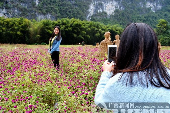 网媒记者在宜州市古文村花海拍照留影。广西新闻网记者 冼妍杏摄