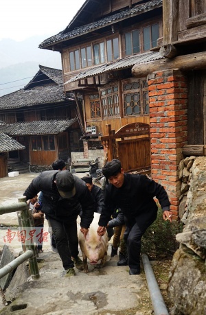 当天上午,几名男子从龙回娟家的吊脚楼下拉出一头猪,推进她的堂屋宰杀。由于猪太沉,大家将它抬上杀猪凳时,竟把一条结实的板凳压垮了。