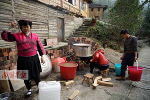 1月21日,桂林市龙胜各族自治县泗水乡周家村白面瑶寨,村民龙回娟的家里杀了一头重约100公斤的猪,并请乡亲们吃庖汤。