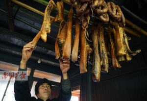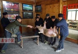 按照当地的风俗,过年杀猪要拉到家里堂屋的香火前宰杀。主人会请前来帮忙的亲朋好友和左邻右舍来家里,把猪上好的肉和内脏,拿出来烹煮,与大家分享,俗称为“吃庖汤”。