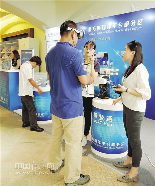 在博鳌官方新媒体平台服务区,与会嘉宾在体验VR直播。经济日报记者 朱 琳摄