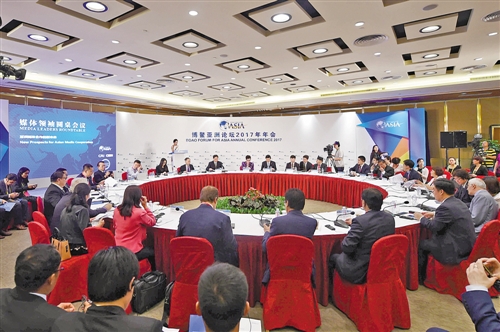 3月23日,博鳌亚洲论坛“媒体领袖圆桌会议”在海南博鳌召开,来自“一带一路”沿线10多个国家的20余位媒体领袖汇聚一堂,围绕“亚洲媒体合作新未来”的主议题,共同探讨在新形势下加强和深化“一带一路”框架下的媒体合作。 新华社记者 杨冠宇摄
