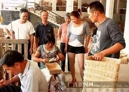 韦金英现场示范编织工艺,指导工人编织。卢保荣/摄