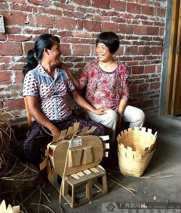 在韦金英(右)帮扶下,贫困村民在家也能编织挣钱。熊春艳/摄