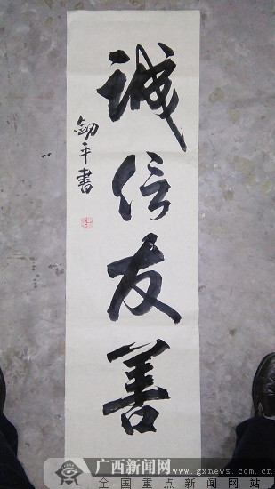 韦剑平,男,壮族,中共党员,国家二级演奏员,1944年出生于广西河池镇;2005年退休前系广西艺术学校教务主任,1980年开始步入书法艺术殿堂,师从陈政、韦士开、朱敬华、钟锦荣等老一辈书法家。出师于南宁市书校研究生班。1984年加入中国书法家协会广西分会,之后又相继加入广西音乐家协会、广西戏曲家协会、广西诗词楹联学会以及中国老年书画研究会,中国名家书画院等;曾任第五届广西老年书画研究会副会长和书法院常务副院长,现为南宁市老年大学书法教授,北部湾书画院、同心书画院院士。