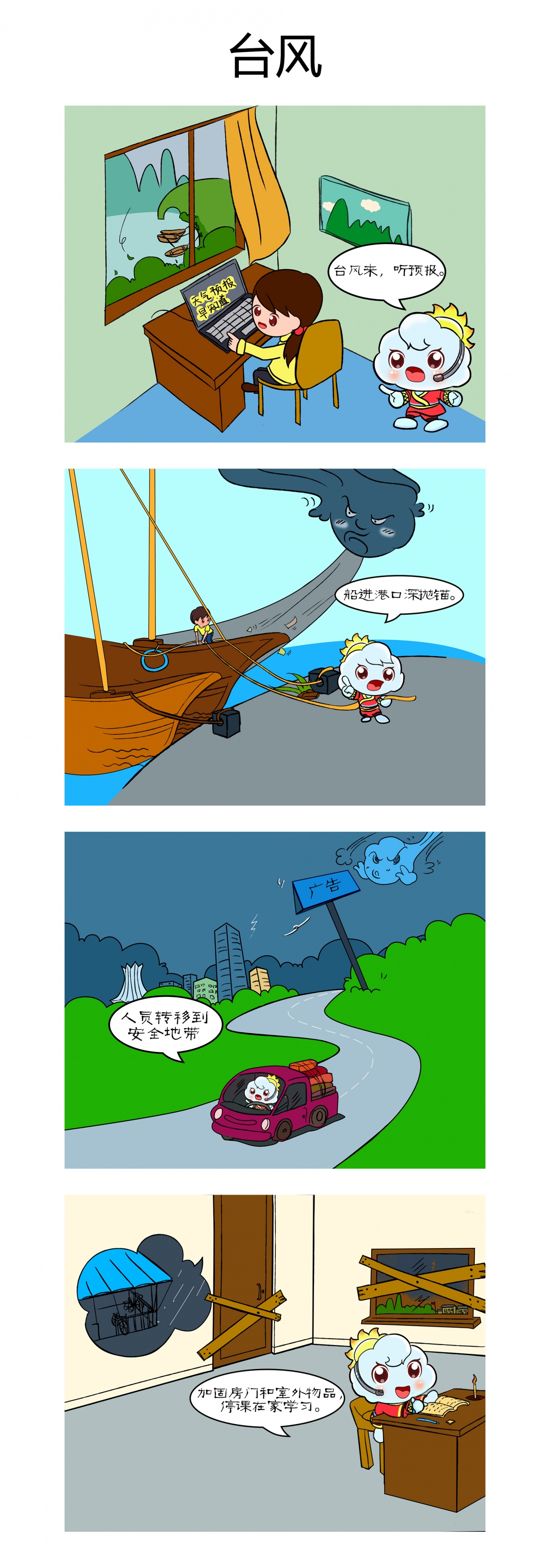 台风来,听预报。加固堤坝通水道,船进港口深抛锚。煤气电路细检查,门窗关闭物收好。学生避课人疏散,灾后防疫很重要。