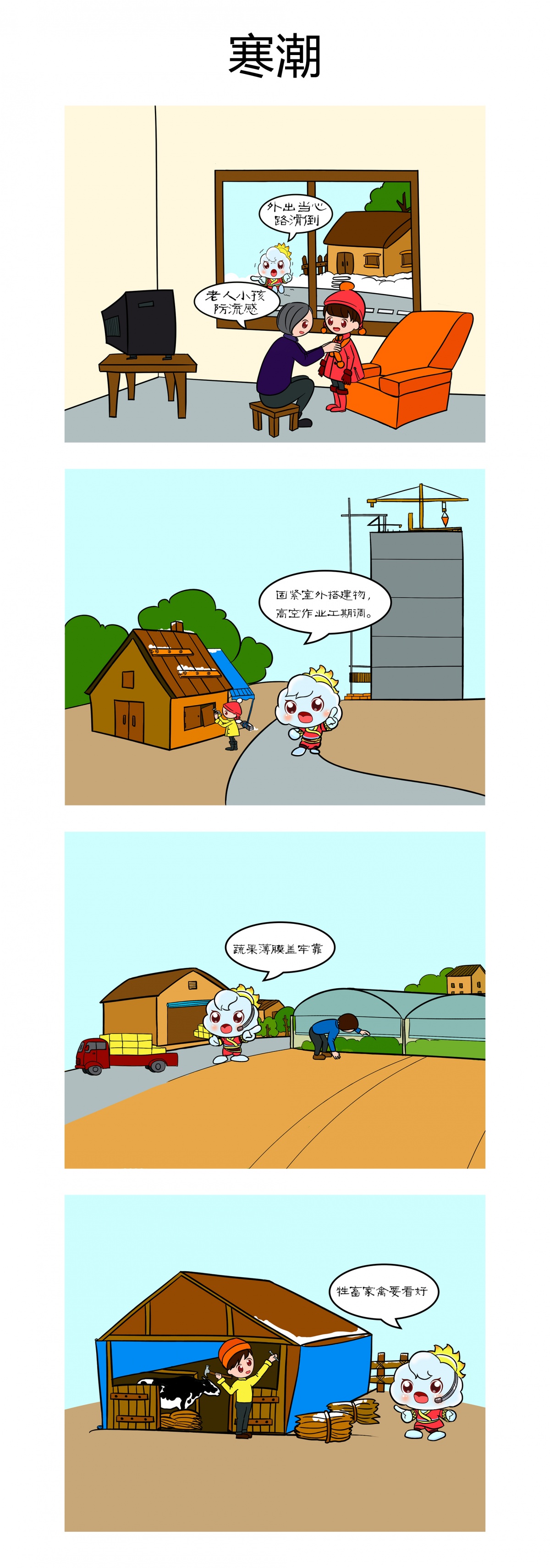 遇寒潮,要保暖。老人小孩防流感,外出当心路滑倒。固紧室外搭建物,高空作业工期调。蔬果薄膜盖牢靠,牲畜家禽要看好。