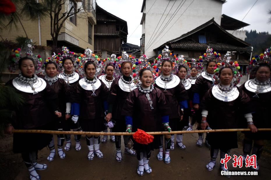 1月28日,广西三江侗族自治县八江镇八斗村中朝屯内,侗族的男男女女、老人小孩均身着隆重的民族服饰,在当地新建的戏台上,以“多耶”(侗语音译,有“踏歌而舞”之意)、芦笙踩堂、吃百家宴等方式,迎接新的一年到来。图为侗族民众在寨子内拉起绳索欢唱拦路歌。 龚普康 摄
