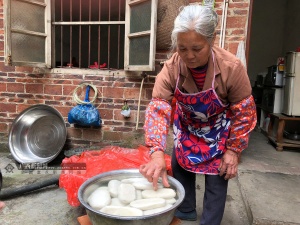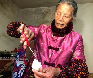 春节不仅意味着家族的团圆,还是一年中美食最丰盛的时候。对于梧州人来说,水浸糍是春节不可少的一道食物。2月8日上午,泗洲村的周阿姨和陈阿姨在自家厨房里互相配合着,将浸泡了一整晚的米打成米浆,陈阿姨把磨好的米浆倒进一口大锅里加热,周阿姨则用棍子不断搅拌,将米浆熬成糊状直到约八成熟时变成面团后出锅。陈阿姨用手沾少许花生油,把面团搓成一块块椭圆形状,放到锅里蒸熟,拿出来冷却过后,再放到清水里浸泡,这样就可以将水浸糍保留一个多月的时间,期间还要经常换水。