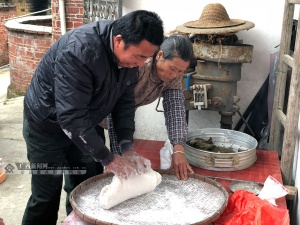 春节不仅意味着家族的团圆,还是一年中美食最丰盛的时候。对于梧州人来说,水浸糍是春节不可少的一道食物。2月8日上午,泗洲村的周阿姨和陈阿姨在自家厨房里互相配合着,将浸泡了一整晚的米打成米浆,陈阿姨把磨好的米浆倒进一口大锅里加热,周阿姨则用棍子不断搅拌,将米浆熬成糊状直到约八成熟时变成面团后出锅。陈阿姨用手沾少许花生油,把面团搓成一块块椭圆形状,放到锅里蒸熟,拿出来冷却过后,再放到清水里浸泡,这样就可以将水浸糍保留一个多月的时间,期间还要经常换水。