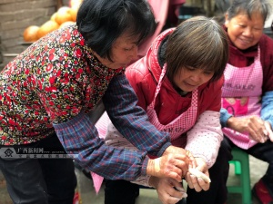 2月7日一大早,富万村蒋阿姨家里十分热闹,左邻右里、亲朋好友齐齐聚在这里,一起制作糖环、大果和年糕等。蒋阿姨告诉记者,糖环、大果和油角等都是本地家喻户晓的传统小吃,逢年过节村里各家各户都会制作。一旁的吴阿姨一边制作糖环一边介绍:“糖环因为形状是圆形的,喻意团圆,一家人环环相扣、和谐共处,大果则象征团圆美满,经过油炸之后香脆可口,老人小孩都爱吃。”