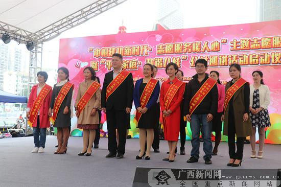 广西新闻网南宁3月5日讯(记者 蒋尧 实习生 白丽华)3月3日,由自治区文明办、自治区妇联主办的“巾帼建功新时代·志愿服务暖人心”主题志愿服务暨“平安家庭·和谐八桂”公益巡讲活动启动仪式在南宁举行。南宁市多家志愿服务团队、巾帼志愿服务项目承接单位,巾帼志愿者、市民等近千人到场参与启动仪式各项活动,充分展现了南宁志愿之城的魅力。