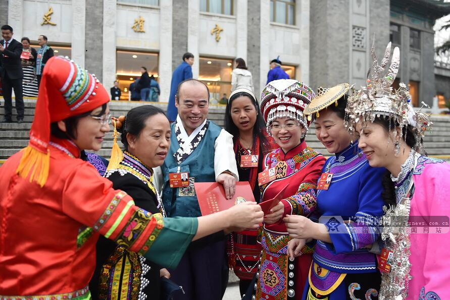 3月14日,少数民族界别的全国政协委员们在住地集体合影后,住桂全国政协委员梁琰(左一)、韦震玲(右二)与其他少数民族委员交流。记者 邓华 摄 广西新闻网-广西日报记者 王春楠 乔晓莹 3月14日一早,住桂全国政协委员梁琰因身体有些不适,早餐吃得很少。 来自内蒙古自治区的蒙古族全国政协委员咏梅细心地发现了这一幕。作为一位医生,她询问情况后,立即拿来几包蒙药冲剂让梁琰服用。服药后,梁琰的身体果然舒服了不少。“我们小组几十名少数民族政协委员,像兄弟姐妹们一样和谐相处,互爱互助。”梁琰说,全国两会既是代表委员参政议政、建言献策的平台,也是各民族大团结的舞台,民族团结之花就这样一年年在首都北京盛开。 不少人还记得全国政协十三届一次会议第二场“委员通道”集中采访活动上,来自云南怒江傈僳族自治州的茸芭莘那委员演唱的民歌。“我去年到广西考察调研过,还学会了唱原汁原味的‘刘三姐’呢!”她笑着告诉记者,自己不仅要为保护本民族文化贡献力量,也要融会贯通、学习吸收别的民族优秀文化,“同时,我们呼吁保护民族文化,不仅仅只是代表本民族,而是要为所有的少数民族鼓与呼。” 今年,茸芭莘那带来了一份提案,呼吁关注“人口较少民族的传统文化的保护”。她希望国家高度重视,尽快开展典藏工作,帮助一些只有民族语言、没有民族文字的人口较少民族,以录音、录像等形式将其文化遗产保留下来。最终,这份提案得到包括住桂全国政协委员韦震玲在内的28个较少民族委员联名提交。 谈起民族团结话题,韦震玲感受颇深。会议期间,她都穿上毛南族盛装,头上戴的“顶卡花”总会引来不少委员的关注。每逢此时,她便积极介绍自己的民族,传播弘扬毛南族的传统文化。韦震玲感慨地说,政协搭建起了协商民主的平台,同时也是少数民族交流、交往、交融的平台,让大家在这个平台上“找出最大公约数、画出最大同心圆”,为民族团结发展作出自己的贡献。 会议间隙,韦震玲还与来自湖南湘西土家族苗族自治州的全国政协委员石红对少数民族女干部学习、成长的现状,交流了意见和看法。见她俩聊得热烈,梁琰和来自内蒙古自治区扎兰屯市的鄂温克族全国政协委员杜明燕也加入其中。小到服饰、饮食等生活习惯,大到扶贫攻坚、区域经济发展,委员们在交流中增进了彼此间的了解互信,也进一步深化了中华民族一家亲的情谊。 3月14日下午,今年所有参会的少数民族界别全国政协委员在住地北京友谊宾馆的友谊宫前合照。大家身着民族盛装,肩并肩,手挽手,热热闹闹地留下合影。欢声笑语中,浓浓的民族团结情在荡漾…… |