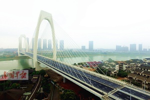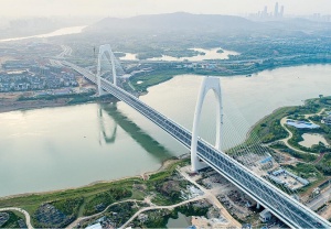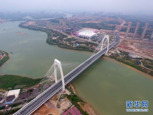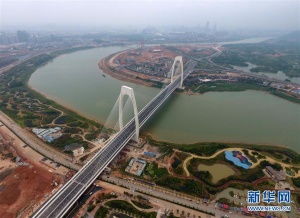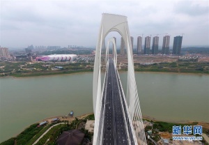 2017年4月24日,记者从南宁市纵横时代公司了解到,邕江上新建成的跨江桥——青山大桥主线于5月1日实现通车。该桥主塔高度和主跨长度,都是目前南宁市主城区范围内,所有跨江桥梁之最。此外,大桥周边配套路网的建设也正在加快推进中,滨堤路、新邕路等预计可同期实现通车。图为青山大桥车道划线已完成。记者 苏华摄(广西新闻网-南国早报)
