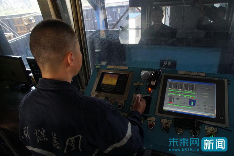 山西省大同市的塔山装车点装满1辆C80重载货车,只需1名工人、1分钟即可。 未来网记者朱延生 摄 “装满1辆C80重载货车,只需1名工人、1分钟即可。整列210辆重载货车仅需4个半小时即可全部装载完毕。” 据悉,大秦铁路在山西境内共有5个2万吨装车点,38个万吨装车点。塔山装车点是一个2万吨装车点,能够实现2.6公里长的2.1万吨重载列车整列装载,通过专用线与大秦铁路的起点韩家岭站连接,列车可直接驶入大秦铁路。 韩家岭站副站长刘玉堂介绍,塔山矿每日产多少,装车点就能装多少。塔山控制台实行轮班制,一位工人负责装一列,每天能不间断地完成对6列C80重载货车的装煤任务。