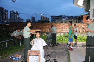 广西新闻网南宁9月9日讯(见习记者 王飞)9月8日,广西区内多所高校拉开新生入学大幕,来自五湖四海的学子们带着兴奋进入大学校园。记者在广西民族大学校园里发现特别的一幕:在一栋宿舍楼前,3位身着制服的学生在给新生们剃头,旁边还围了一圈人。这是怎么一回事?