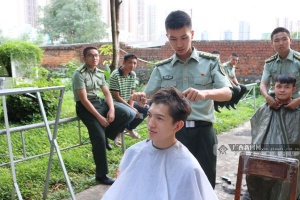 原来,身穿制服、手拿推子的是广西民族大学人民武装学院公共事业管理(国防教育与管理方向)专业的大四学生,此刻,他们是在给本学院2018级新入学的学弟们进行入学前的剃头。作为学长的唐荣浩告诉记者,因为他们这个学院比较特殊,从一开始就有给新生剃头的传统,这么多年一直都延续下来了。
