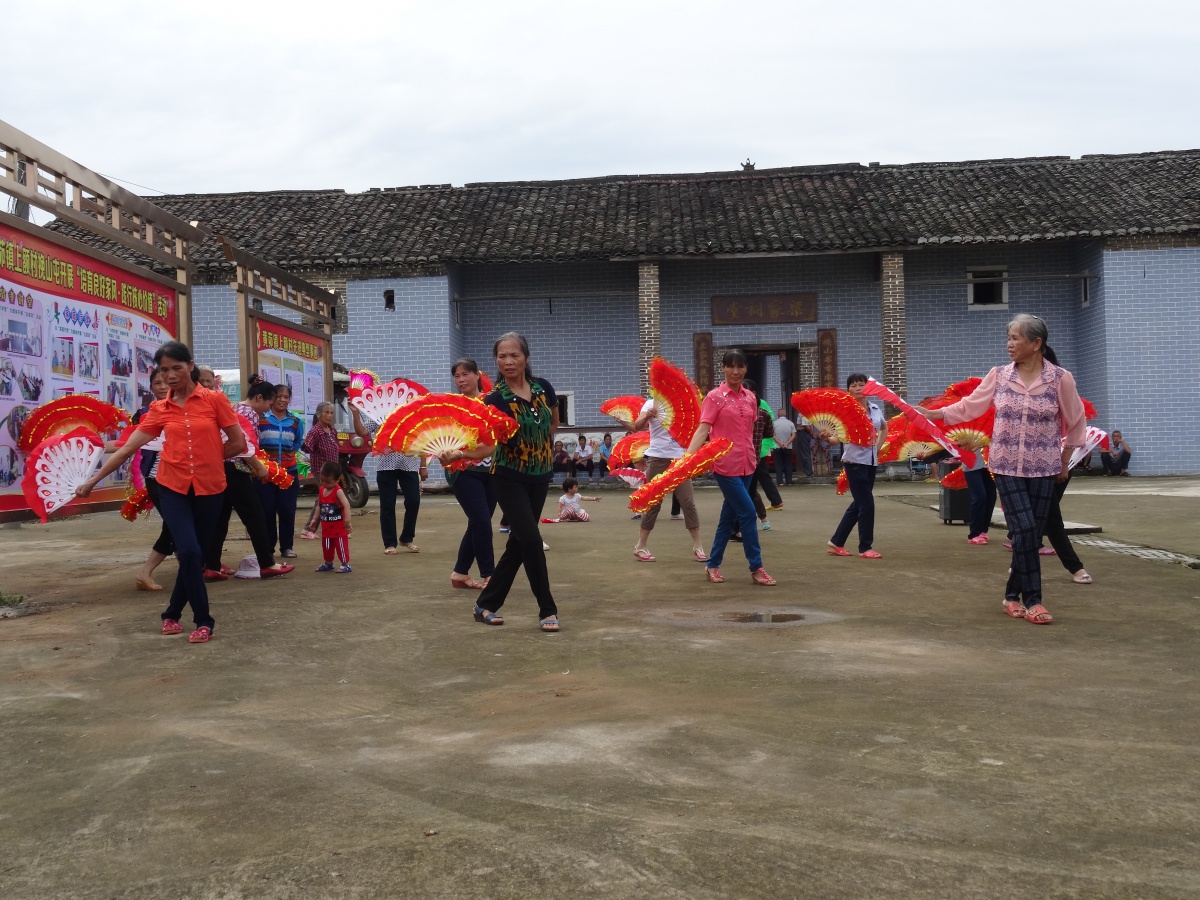 来宾市武宣县黄茆镇上额村挽山屯村民在梁家祠堂主题文化广场跳舞。