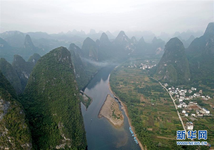 桂林阳朔县兴坪镇漓江景色(10月18日无人机拍摄)。新华社记者 周华 摄