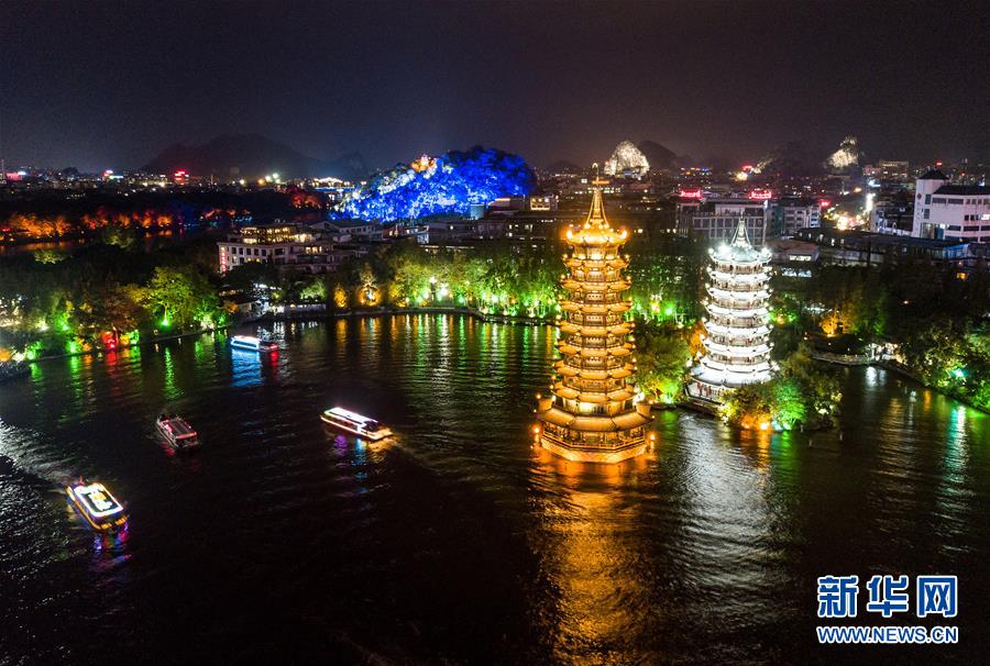 游人乘船在桂林杉湖的日月双塔附近游览(10月17日无人机拍摄)。新华社记者 李鑫 摄