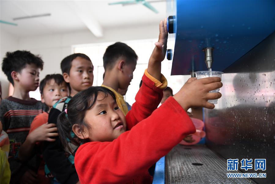 在广西都安瑶族自治县下坳镇隆麻小学,学生在饮水机边接水喝(11月6日摄)。 从泥瓦房到崭新的教学楼、山村教师逐渐“下得去、留得住”、许多山里娃通过读书改变命运……广西坚持将教育作为最重要、最长远的民生工程进行投入,乡村教育“短板”不断补齐,越来越多山里娃正享受到更公平、更有质量的教育。 新华社记者 陆波岸 摄