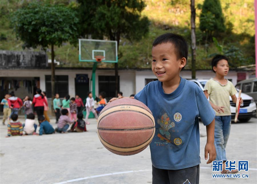 在广西都安瑶族自治县东庙乡三团小学,学生在课间打篮球(11月6日摄)。 从泥瓦房到崭新的教学楼、山村教师逐渐“下得去、留得住”、许多山里娃通过读书改变命运……广西坚持将教育作为最重要、最长远的民生工程进行投入,乡村教育“短板”不断补齐,越来越多山里娃正享受到更公平、更有质量的教育。 新华社记者 陆波岸 摄