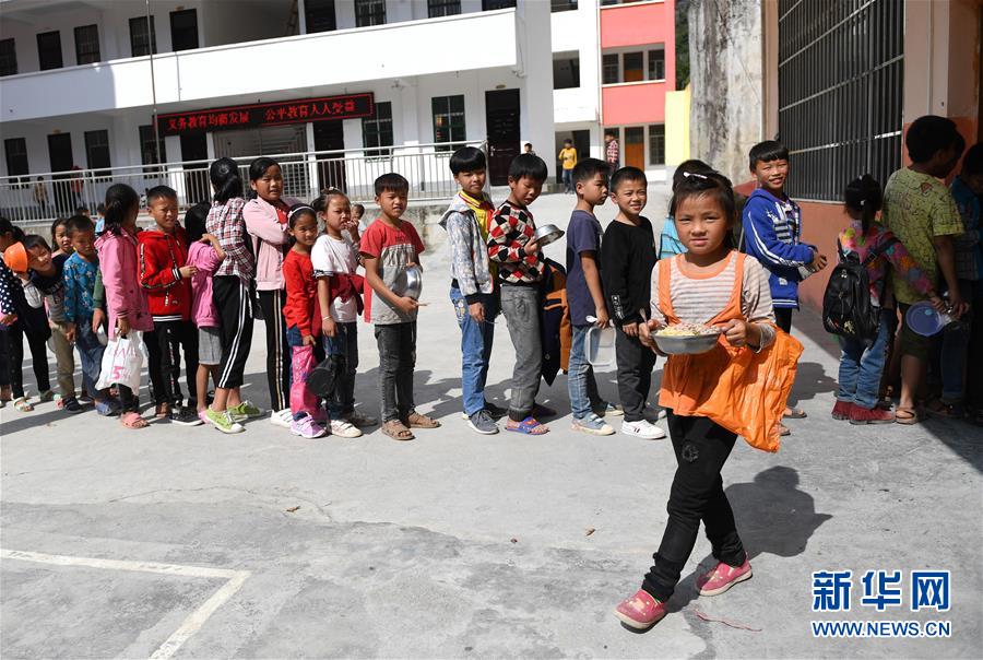 在广西都安瑶族自治县下坳镇隆麻小学,学生排队领取营养午餐(11月6日摄)。 从泥瓦房到崭新的教学楼、山村教师逐渐“下得去、留得住”、许多山里娃通过读书改变命运……广西坚持将教育作为最重要、最长远的民生工程进行投入,乡村教育“短板”不断补齐,越来越多山里娃正享受到更公平、更有质量的教育。 新华社记者 陆波岸 摄