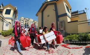 壮乡绽放团结花。2018年,扶绥县东门镇易地扶贫搬迁安置小区举行集体搬迁仪式,各族群众开心搬家入住。卢文斐 摄