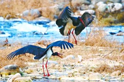 为拍起飞身姿,竟向黑鹳抛石块