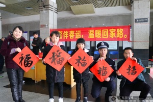 在桂林火车站,民警联合桂林市象山区人民法院、中共象山区南门街道党工委、桂林市护路办、桂林市象山区书法协会及车站工作人员,在售票厅及候车室内开展了“铁警伴春运,温暖回家路”法制宣传活动。活动中,民警为群众们讲解了春运期间应当注意的相关法律法规,提醒旅客出行期间严禁携带各类违禁品,和谐有序乘车出行,切勿“霸座”以及在动车上吸烟等。