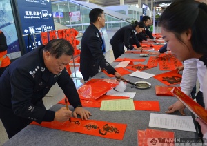 民警在南宁东站为旅客写春联。广西新闻网通讯员韦贺今 孟祥龙摄