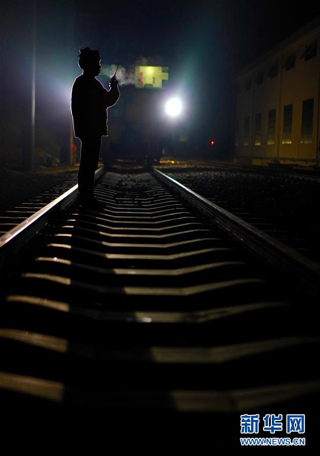 1月22日晚,江西鹰潭工务机械段的工作人员在指挥机车作业。新华社记者胡晨欢摄