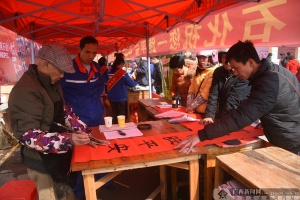 在梧州市东出口春运服务站,一位老人正在现场书写对联,赠送给返乡务工人员。广西新闻网记者 胡瑞阳 摄