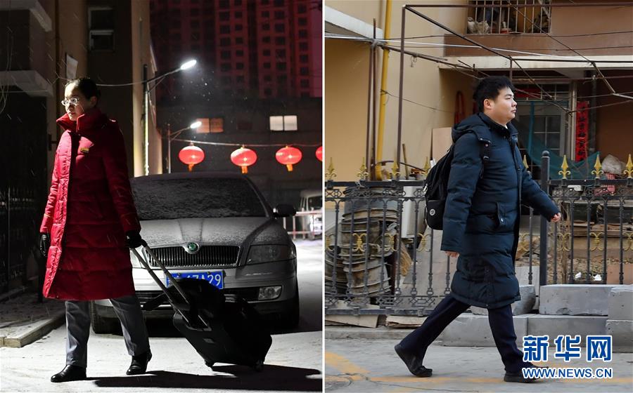 拼版照片:左图为张文烨出门上班(2月16日摄);右图为马锦钊出门上班(2月14日摄)。 新华社记者 曹阳 摄