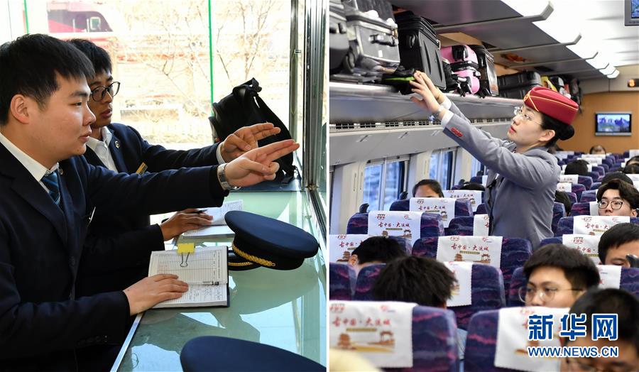 拼版照片:左图为马锦钊(前)在确认运行揭示(2月16日摄);右图为张文烨在整理旅客的行李(2月14日摄)。新华社记者 曹阳 摄