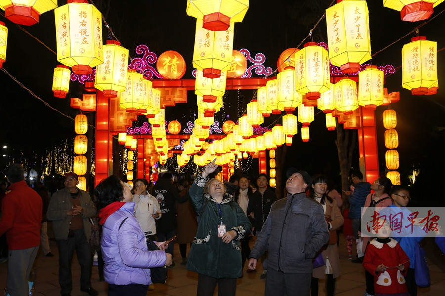市民在南宁园博园内猜灯谜。 西乡塘区 2000多盏花灯与你共度良宵 南宁市西乡塘区的元宵花灯文化节人气颇旺。今年,西乡塘区第三届元宵花灯文化节在安吉万达广场举行。目前,花灯文化节已经收集了10组大型花灯,1个大型灯阵,6个灯谜灯阵,35组兔子花灯,2000多盏手工花灯。这些花灯于12日开始搭建,在19日最美绽放。 除了赏花灯外,19日晚这里还有西乡塘区元宵晚会、千份汤圆免费派发、猜灯谜赢礼品、灯笼DIY、元宵快闪巡游活动等,丰富多彩。其中,灯笼DIY活动将请来民间制作花灯的手工艺人现场展示花灯制作,并邀请家庭参加。 在17日至19日,现场还举行元宵写福送福活动,邀请书法爱好者现场挥毫写福字,送给到场赏灯的游人。18日、19日,西乡塘区图书馆推出元宵节传统文化展,现场展示涵盖元宵节由来、元宵制作、花灯工艺等多方面知识,普及元宵节传统文化。 邕宁区 多个大型灯组等你来 今年,南宁园博园举行开园后的第一届元宵灯会——2019年园博园(邕宁)元宵灯光艺术节,在2月16日至19日举行。 本届灯光艺术节策划了“欢乐中国年”“邕宁文化”“梦幻华彩”三大彩灯组团。其中,“欢乐中国年”组团的“福气临门”灯组,高度约10米、长度达30米,营造了震撼的景观。几个组团的13个大型灯组,依托园博园亭台楼阁、低丘碧水园林生态背景,整体规模宏大,特色鲜明。 现场还策划了以“园博元宵喜乐夜”为主题的系列活动,规划设置了舞台表演区(民俗歌舞表演)、互动游戏区(猜灯谜、集章换好礼等游戏任务)、场景拍照区(“我在邕宁拍全家福”等活动)、手工DIY区(环保花灯DIY等节点)及“百变大咖秀”特色巡游五大区域开展活动,供市民游乐。 元宵节当晚,主办方还邀请邕宁区的福气使者“花婆”,为游客送元宵。