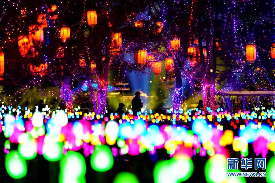 2月17日,游客在唐山市南湖公园欣赏花灯。 新华社记者 杨世尧 摄