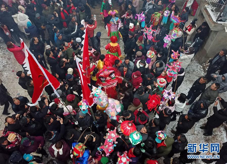 2月17日,在甘肃省陇南市武都区鱼龙镇卯家庄村,当地村民观看高山戏演员在村内巡游表演(无人机拍摄)。 临近元宵节,发源于甘肃省陇南市武都区鱼龙镇的高山戏在当地山村中开演。武都高山戏至今已有七百余年的历史,2008年入选第二批国家级非物质文化遗产名录。 新华社记者 才扬 摄