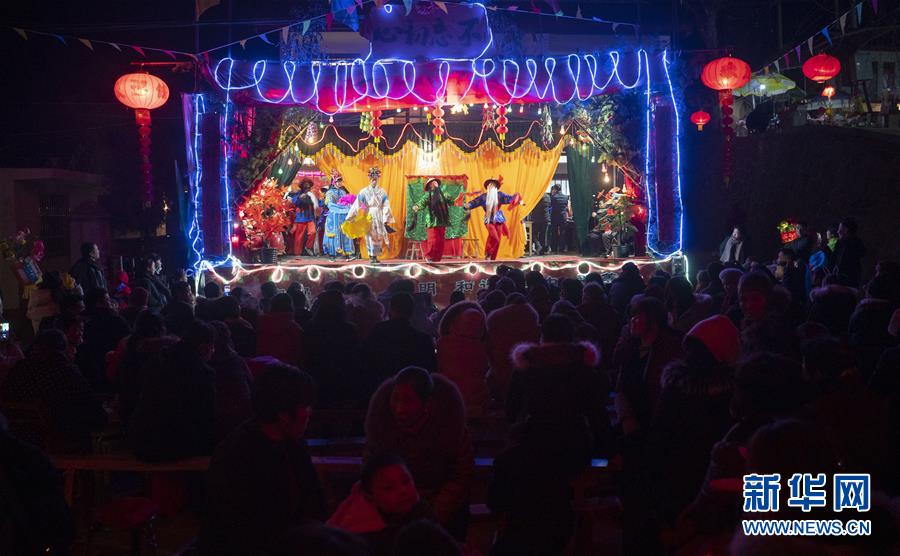 2月16日,在甘肃省陇南市武都区鱼龙镇刘家湾村,村民们观看高山戏表演。 临近元宵节,发源于甘肃省陇南市武都区鱼龙镇的高山戏在当地山村中开演。武都高山戏至今已有七百余年的历史,2008年入选第二批国家级非物质文化遗产名录。 新华社记者 才扬 摄