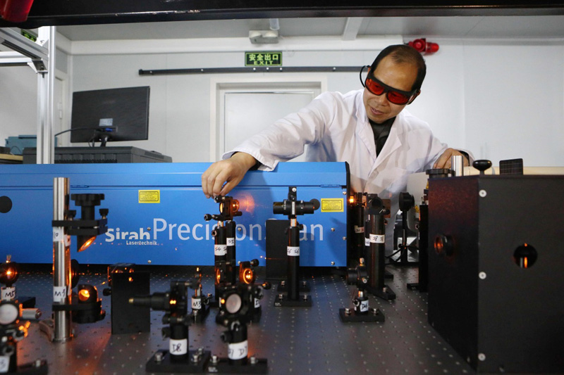 科考队员黄文涛在调整和优化光路(2月11日摄)。新华社记者 刘诗平 摄 中国第35次南极科学考察队日前在南极中山站顺利完成钠荧光多普勒激光雷达探测系统的安装和调试,首次同时探测到南极中间层顶区大气温度和三维风场,填补了极隙区中高层大气探测的空白。
