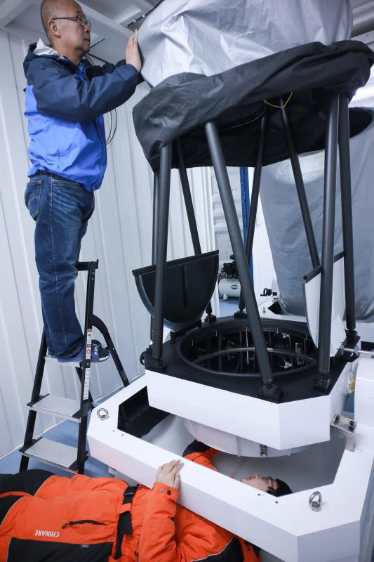 科考队员在调整大口径光学望远镜指向(2月11日摄)。新华社记者 刘诗平 摄 中国第35次南极科学考察队日前在南极中山站顺利完成钠荧光多普勒激光雷达探测系统的安装和调试,首次同时探测到南极中间层顶区大气温度和三维风场,填补了极隙区中高层大气探测的空白。