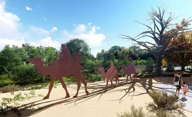 来到内蒙古的西部,您将会邂逅阿拉善广袤神秘的大沙漠。内蒙古是我国沙漠面积第二大的省区,世界第一高沙山毕鲁图峰也位于这里。卷三“浩瀚的沙漠”就通过对内蒙古沙漠景观、特色沙生植物及沙障的展示,体现治沙的科学性以及人与自然共生共存的生态修复理念;骆驼商队的景观小品映射了草原丝绸之路当年的通达和繁忙;矗立的胡杨代表着坚毅不屈的精神,折射着这片土地上人们百折不挠的气节。